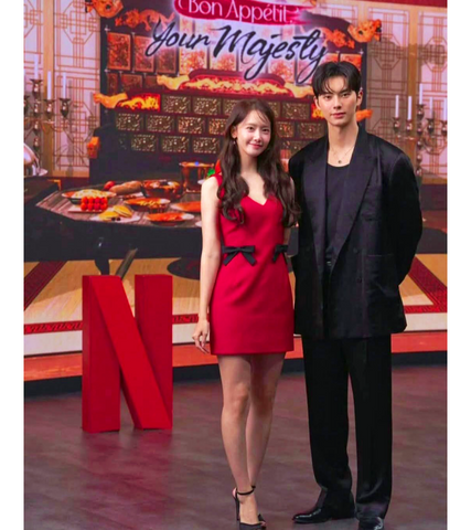 If you are a fan of Yeon Ji-Young's simple yet stylish wardrobe then you definitely shouldn't miss this gorgeous and fiery hot dress with cute bow ribbons inspired by the outfit that Lim Yoon-A has been spotted wearing for the Netflix's preview party of "Bon Appétit, Your Majesty"!