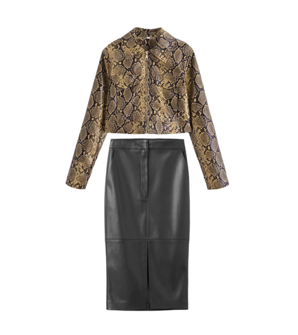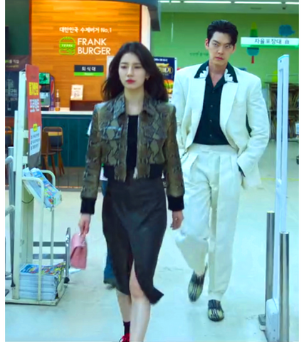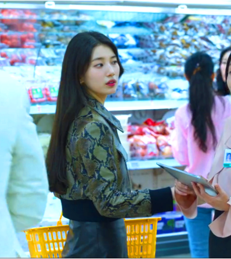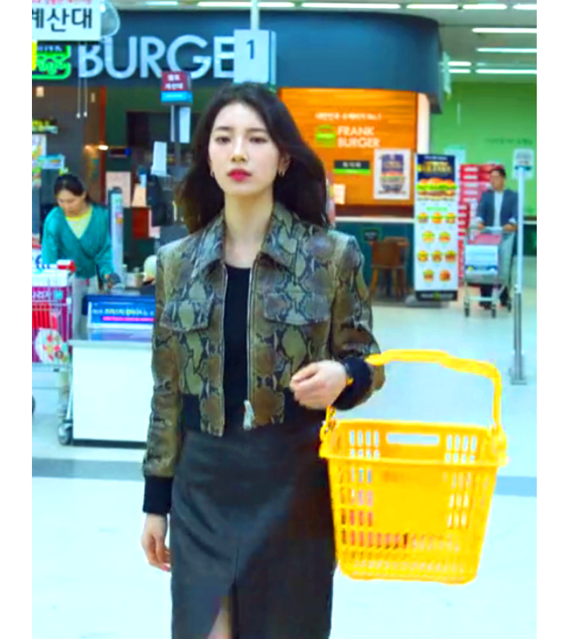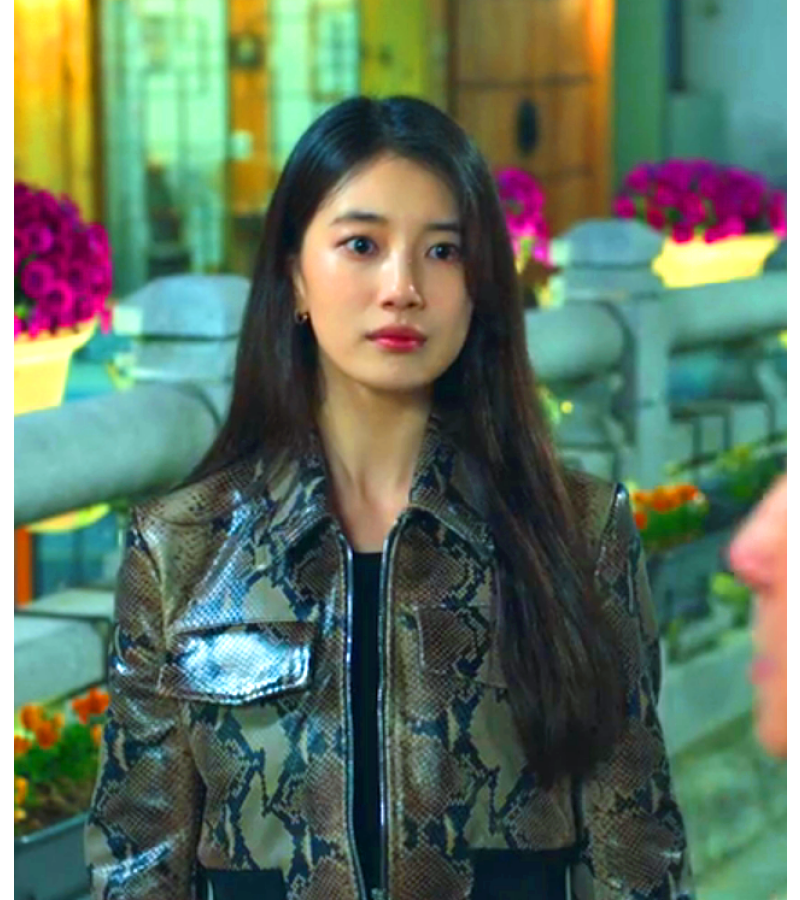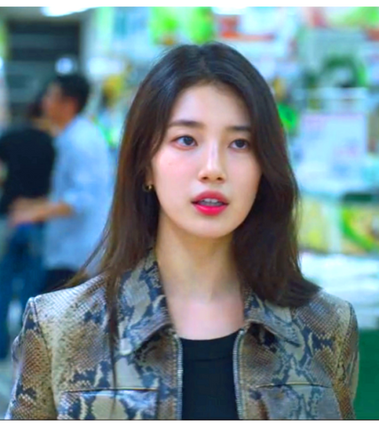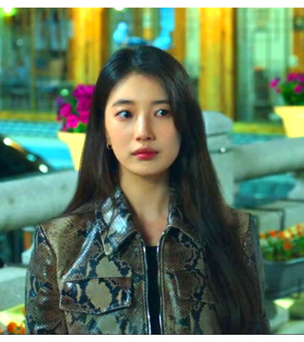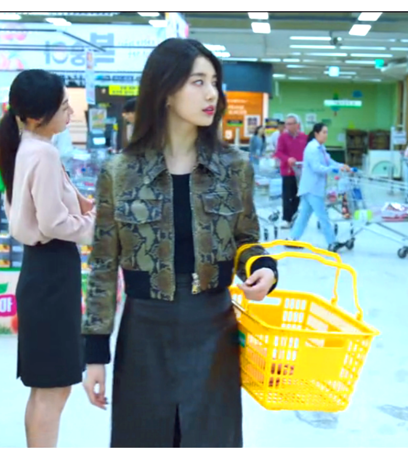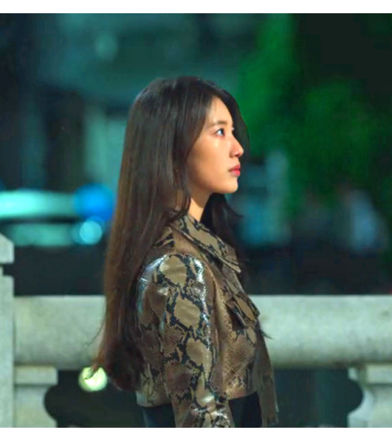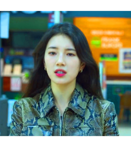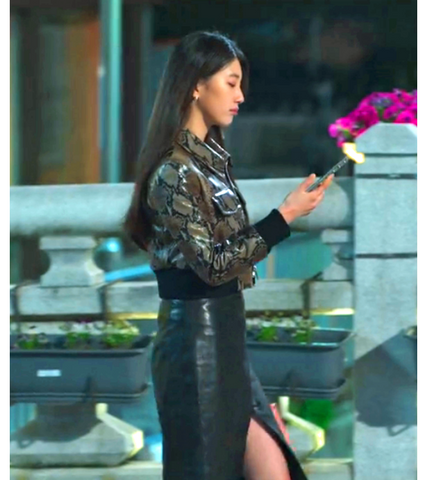 If you are a fan of the stylish wardrobe of the mesmerizingly pretty and cute actress, Bae Suzy, then you definitely must not miss this edgy and city chic set of synthetic leather jacket with a cool snakeskin pattern and black leather skirt, inspired by that seen on Bae Suzy in the drama!