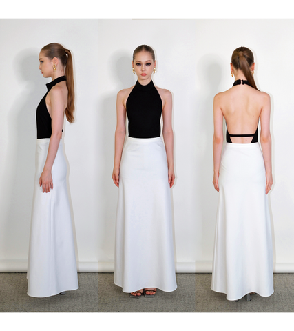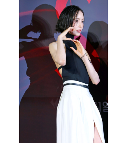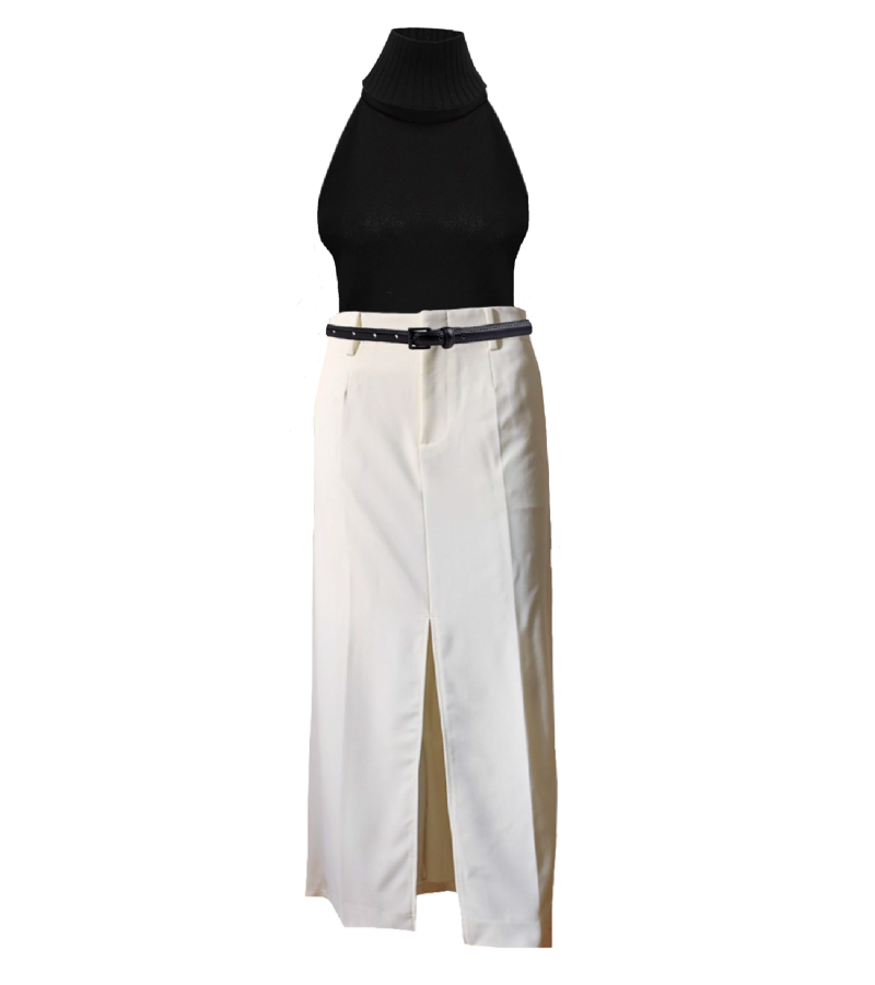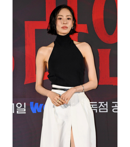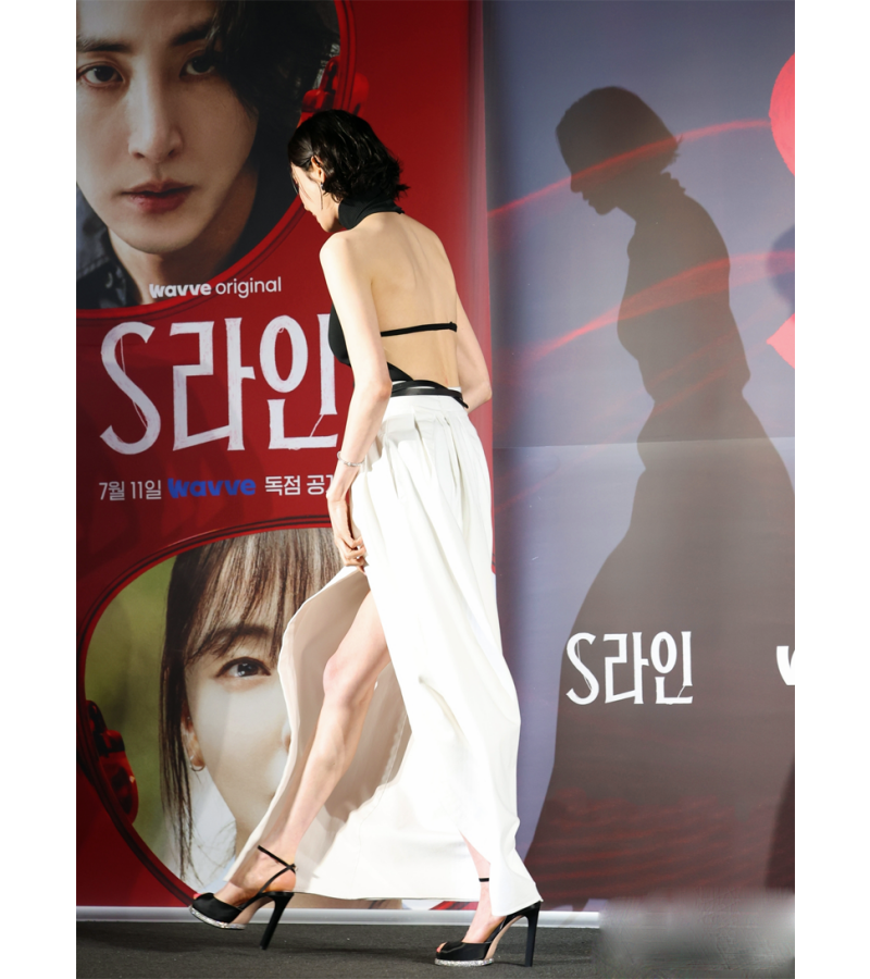 Don't miss out on this stylish yet sexy backless halter-neck bodysuit and midi white skirt with a deep slit inspired by the outfit that Lee Da-hee was spotted wearing to the press conference of "S Line"!