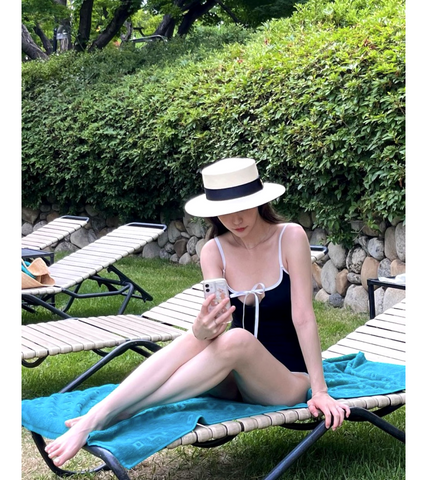 If the confident traditional dance university beauty, Chung You-jin, from Single's Inferno 4 has captured your attention with her infectious smile and laughter then you definitely shouldn't miss out on her refined and alluring wardrobe, like this pretty piece of french romantic monochrome swimwear with a seductive peek-a-boo detail at the bust!